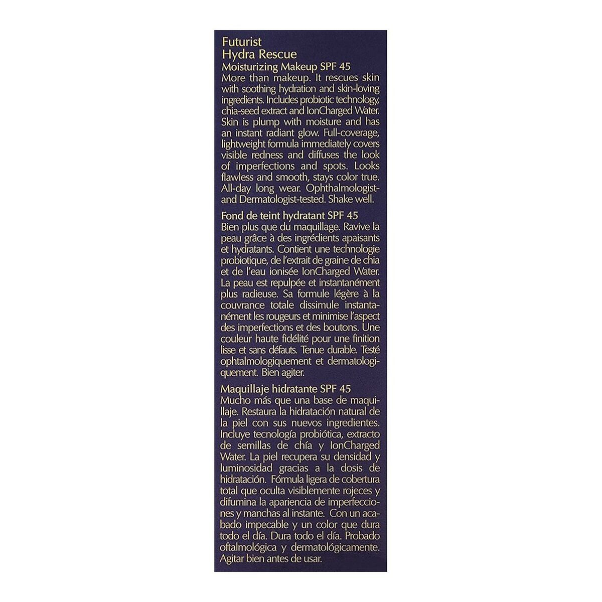 Die Futurist Hydra Rescue von Estée Lauder ist eine fortschrittliche cremige Make-up-Grundlage, die für eine gleichmäßige und langanhaltende Deckkraft mit einem natürlichen und angenehmen Finish entwickelt wurde. Für ein unisex Publikum konzipiert, ist diese Foundation in Schlüsselnuancen wie Schwarz, Beige und dem speziellen Ton Nº 3C2-Pebble erhältlich und passt sich verschiedenen Hauttönen an. Ihre flüssige und cremige Textur ermöglicht eine sanfte und gleichmäßige Anwendung für ein makelloses Finish ohne schweres Gefühl. Zudem enthält sie einen SPF 45 Sonnenschutz, der die Haut vor UV-Schäden schützt – ein unverzichtbarer Faktor für die tägliche Gesichtspflege. Die wasserfeste Formulierung erhöht die Haltbarkeit des Make-ups selbst bei Feuchtigkeit oder Schwitzen und sorgt für ein langanhaltend intaktes Ergebnis. Hergestellt und vertrieben in Spanien und den USA, besticht diese Foundation durch ihre Premiumqualität im Bereich der feuchtigkeitsspendenden Make-ups und verbindet Deckkraft mit pflegenden Vorteilen für die Haut. Die Futurist Hydra Rescue ist eine technische und funktionale Wahl für alle, die ein Make-up suchen, das Schutz bietet und gleichzeitig einen gesunden, ebenmäßigen Teint verleiht – ideal für den täglichen Gebrauch. Ihr ausgewogenes Verhältnis von Haltbarkeit, Feuchtigkeit und Komfort macht sie zu einem Referenzprodukt für Anwender, die Wert auf Wirksamkeit und Pflege in ihrer Foundation legen.